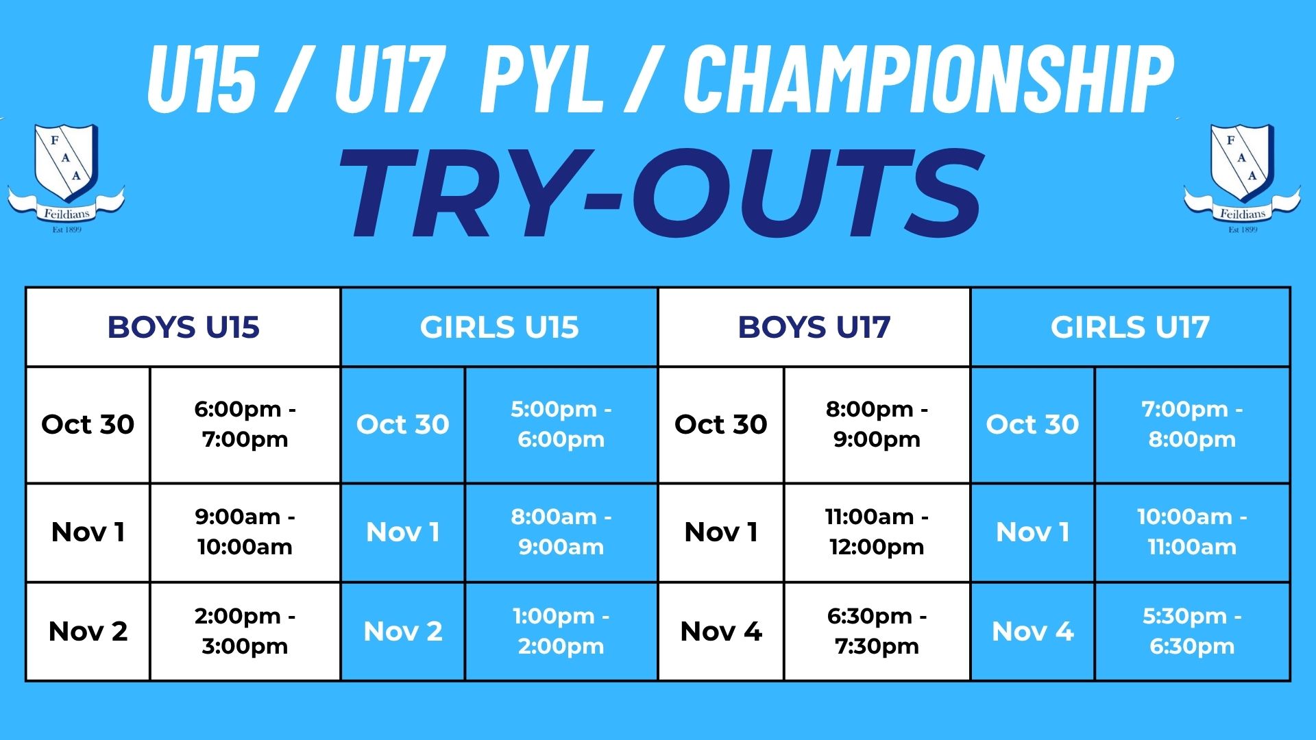 Championship League teams are rep teams that complete in a province-wide league with U15 & U17 age divisions. This league is a developmental league for the Premier League and players can be called up to the FAA Premier League team in case of injury or a shortage of players for that particular game.